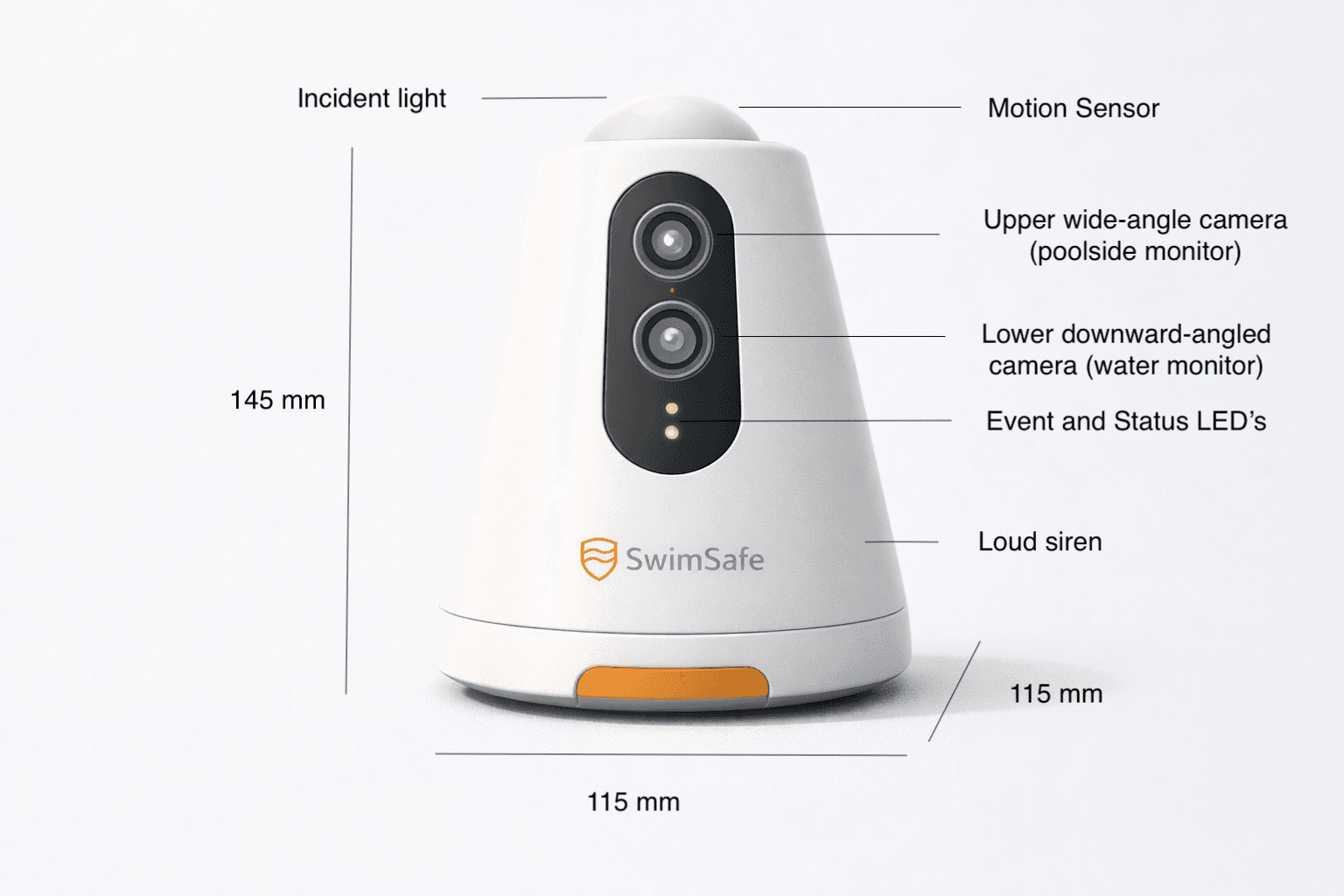 SwimSafe is a smart poolside safety system that helps spot risky moments early — with enhanced water-surface monitoring when installed higher.